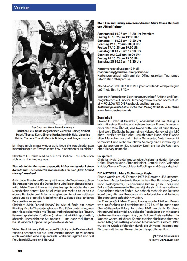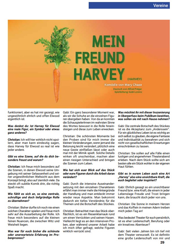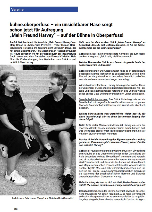 Am 04. Oktober feiert die Komödie „Mein Freund Harvey“ von Mary Chase in Oberperfuss Premiere – voller Humor, Herzlichkeit und Tiefgang. Im Zentrum steht Elwood P. Dowd, der mit einem unsichtbaren, 1,80 Meter großen Hasen befreundet ist. Heute sprechen wir mit der Regisseurin der Inszenierung Gabi Lorenz und dem Darsteller von Elwood Christian Heis über die Vorbereitungen, ihre Gedanken zum Stück – und natürlich über Harvey.