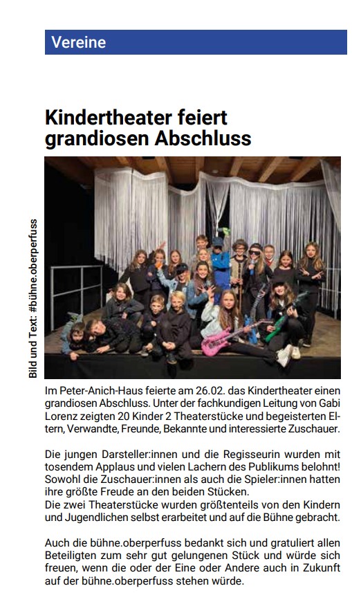 Die zwei Theaterstücke wurden größtenteils von den Kindern und Jugendlichen selbst erarbeitet und auf die Bühne gebracht. Auch die bühne.oberperfuss bedankt sich und gratuliert allen Beteiligten zum sehr gut gelungenen Stück und würde sich freuen, wenn die oder der Eine oder Andere auch in Zukunft auf der bühne.oberperfuss stehen würde